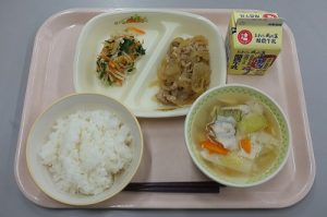 ・ご飯 ・牛乳 ・豚肉の生姜炒め ・三色ナムル ・ワンタンスープ