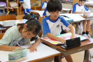 4年生が図画工作科の時間に描いてきた「まぼろしの花」が完成しましたので、「作品のタイトル」を付け、「がんばったところ」「工夫したところ」などを書いていました。どんな色や形の花、どんなにおいのする花になったのでしょうか。