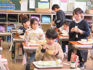 汁物に入っている「きりたんぽ」は、白米を粗くつぶして棒に巻き、表面を焼いたものです。きりたんぽ鍋は、収穫の喜びを分かち合うものとされており、お客さんをもてなすためには欠かせない料理です。