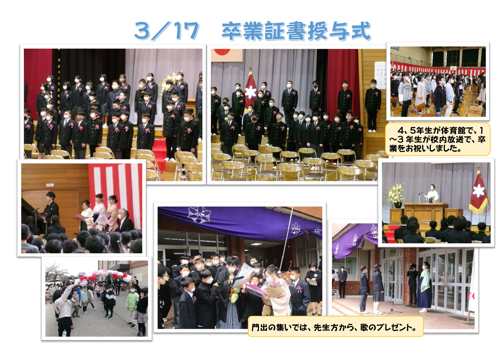 今年度は、全校児童が体育館に入り、修了式を行いました。一人一人しっかりと校長先生のお話を聞き、1年間を振り返りました。
