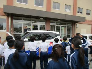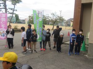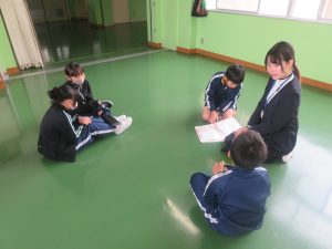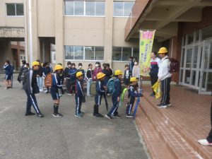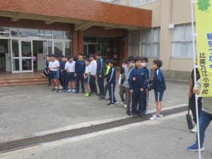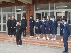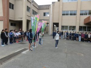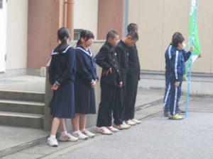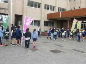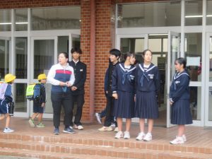 北部中学校の生徒が本校に来て、児童玄関で本校児童と一緒にあいさつをしてくれました。