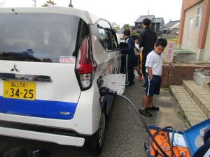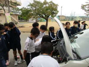 そして、北陸電力さんが用意してくださった電気自動車を見せてもらい、ガソリンで走る車との違いを見付けました。