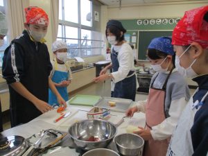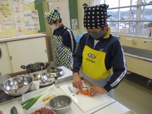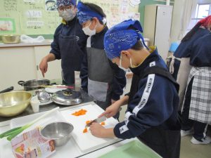 氷見産のねぎやさつまいもなどを使って、具だくさんみそ汁とごはんを作りました。班で協力しながら、安全に調理することができました。