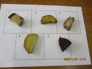 収穫した5種類のおいもを、品種を隠して食べました。子供たちは「味が違う!」「おいしい」と、食べ比べを楽しんでいました。