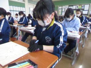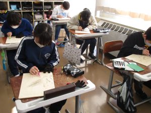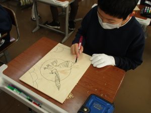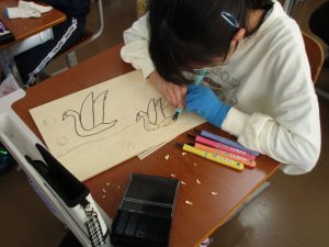 昨年はゴム板でしたが、今年は木版画に挑戦するため、彫り方や使う彫刻刀の種類を選びながら彫り進めていました。