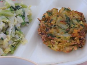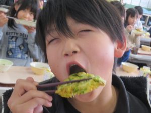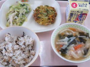 1日目は、昭和とは離れて「未来の食材」を使った献立です。「未来の食材」とは、世界自然保護基金が発表した、地球にやさしく、安く手に入り、栄養価の高い食材のことです。今日の給食は、50種類の「未来の食材」の中から「キヌア・ごま・シコクビエ・ほうれん草・れんこん・チンゲン菜・えのき・わかめ・大豆」の9種類を使っています。これらの食材は、食の持続可能性を高め、私たちの健康を守るための食材として期待されています。また、「ひみコロかき揚げ」の中には氷見でとれたさつまいも、ほうれん草が入っています。今の世代を便利に暮らしながら、未来の世代も同じように豊かに暮らせるよう、選ぶ食品についても考えていけるといいですね。