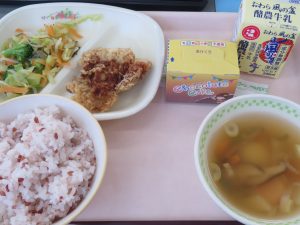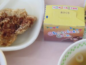 あかまいごはん ぎゅうにゅう おいわいケーキ ヒレカツ こんぶあえ こうはくだんごのすましじる