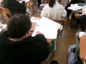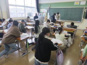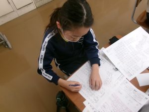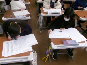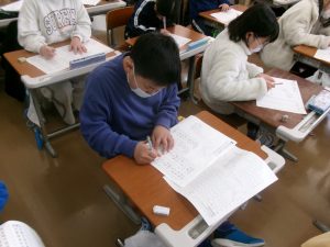 社会科の授業では、都道府県と県庁所在地のテストに向けて、プリント学習に取り組みました。