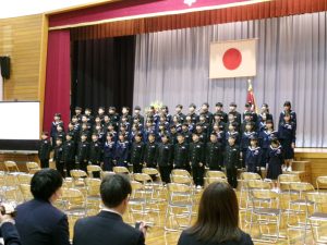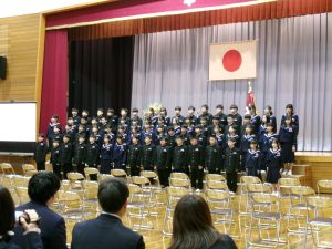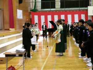 門出の式では万歳三唱をし、アーチを作って見送りました。