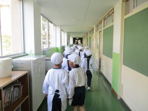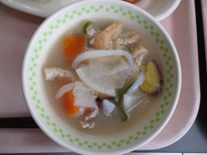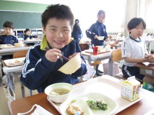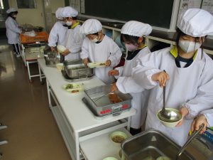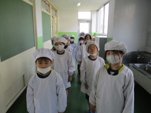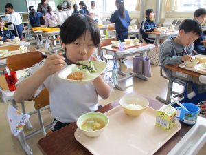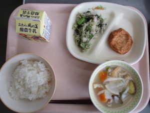 4/17(金)おいしい給食 2026年4月17日 今日の給食 ごはん ぎゅうにゅう がんものふくめに こまつなのごまみそあえ ぶたじる 2年生の給食準備の様子です。 自分たちで廊下に並んで配膳室に取りに行きます。 上手に盛り付けできました!