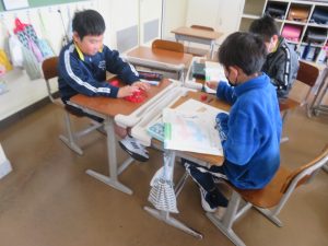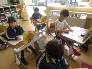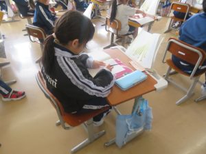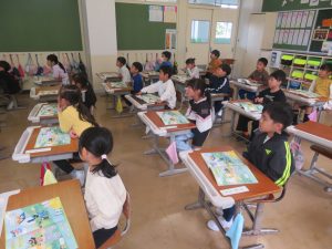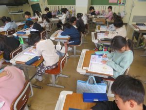 6年生に教えてもらいながら1年生も給食の準備を頑張っています。