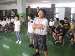今日は、初めて2年生全体で練習を行いました。大きな声でせりふを言って、身ぶり、手ぶりを使いながら役になりきって演じていました。