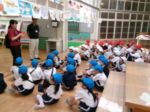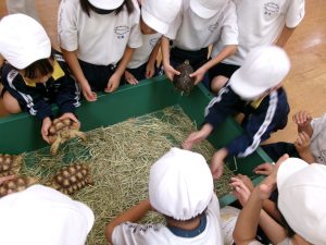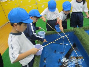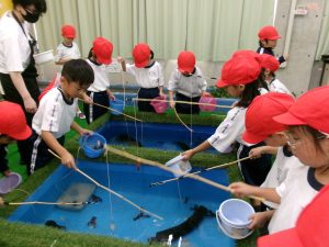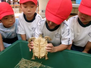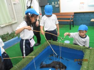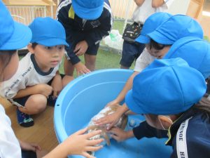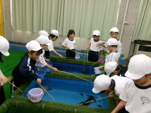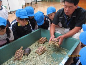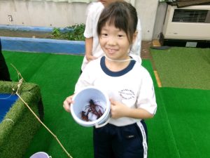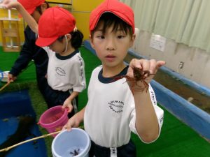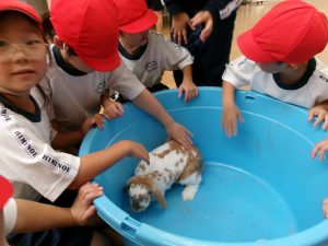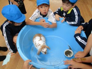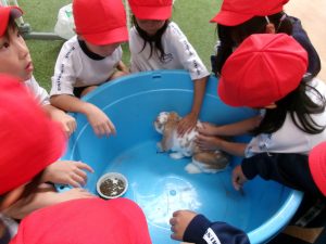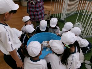 お話を聞いた後に、色団ごとに分かれてウサギやカメとのふれあいや、ザリガニ釣りをしました。