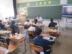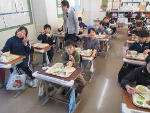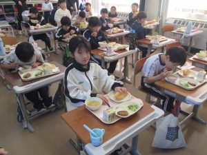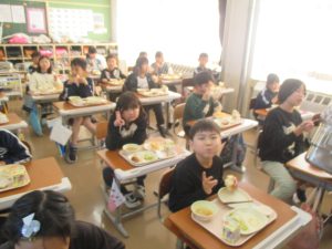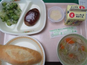 今日の給食では、輪切りに切ったキュウリと、なぞの物体の正解が入っています。