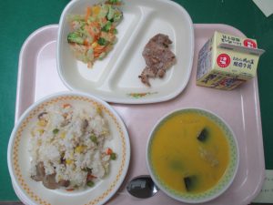 今日は、ハロウィンにちなんで、かぼちゃを使った献立です。
