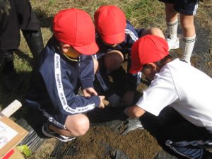 赤・白・青団に分かれて、植えたさつまいもを収穫します。おいもを傷つけないように、土をそーっとかき分けて、掘っていました。