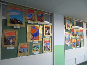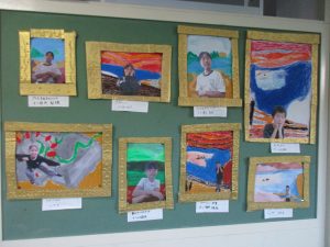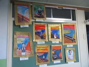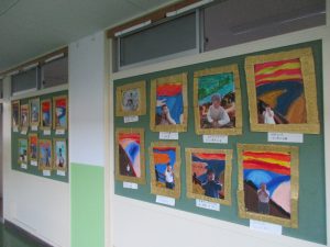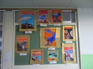 4つの名画の中から、自分で選んだ作品の背景をクレヨンや絵の具等、イメージに合うようにそれぞれ描画材を決め、描きました。