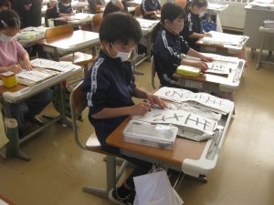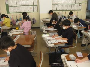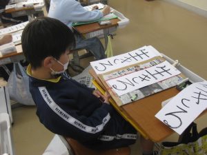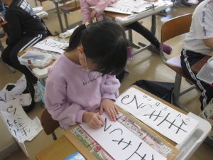 12月になって、書初練習が始まりました。今年、書く字は「生きる」です。昨年と違って、漢字が一文字入ってレベルアップしました。書くときのポイントは、「ゆっくり、濃く、太く、大きく」の4つです。しーんと静かな雰囲気の中、お手本をよく見て集中して書いていました。