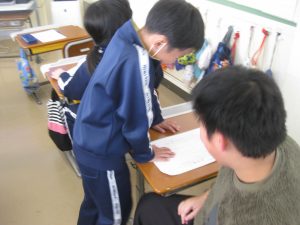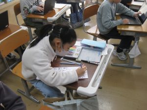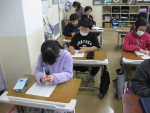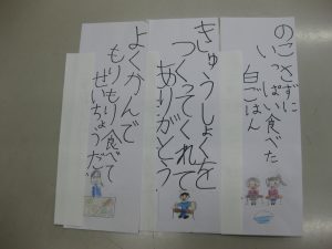 1月24日から30日までの1週間は、全国学校給食週間です。2年生は、比美乃江小学校のみんなが給食をたべたくなるような標語を作りました。「バランス良く」「よくかんで」などのキーワードを入れて、5・7・5のリズムで、友達と相談しながら楽しく作りました。