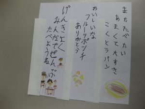 作った標語は画用紙にていねいな字で書いて、カラフルなイラストも描きました。みんなが給食を食べたくなるような、すてきな標語に仕上がりましたね。これからも、感謝の気持ちをもって、おいしい給食を食べましょう。