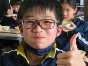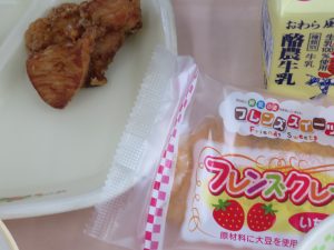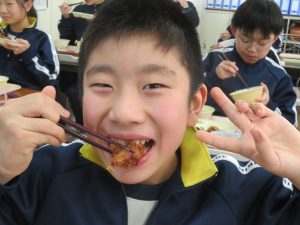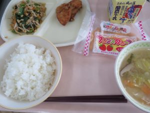 今日の献立は、比美乃江小学校の6年生のリクエスト1位の主菜「鶏肉のから揚げ」、副菜「小松菜の納豆あえ」、汁物「坦々春雨スープ」、デザート「いちごクレープ」です。