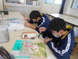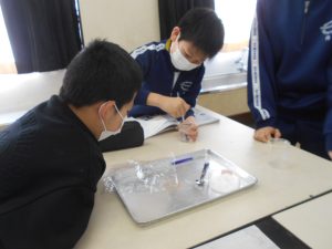 正しく実験を行うために、「水の量は目盛りを垂直に見ること」、「食塩はすり切りで、同じ量になるようにすること」など、班で確認し合うことで、協力して学習を進めていました。