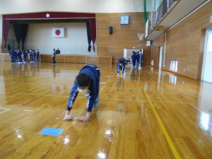 2月27日(金)に体育館のワックスがけに向けて、掃除を行いました。