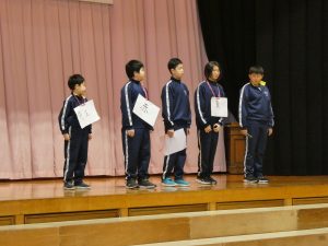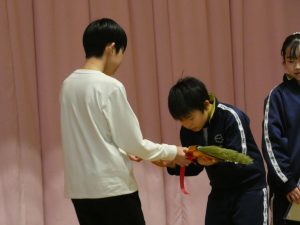 6年生から児童会活動、交通安全、縦割り清掃の班長を受けつぎ、学校のリーダーとして努力していくことを約束しました。