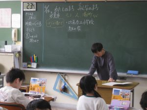 社会科では、氷見市に何があるかを考えてノートに書き、発表しました。お店や有名な食べ物等をたくさん見付けることができました。