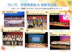 10月11日(土)に学習発表会を行いました。 それぞれが自分の目標をもって、練習に取り組んできました。 真剣な表情やきびきびとした動き、そしてとびきりの笑顔と5年生みんなの姿に感動しました。 そして、5年生も折り返し地点