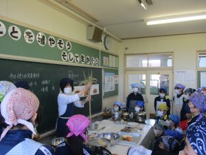 講師の先生方をお招きして、氷見の食材を使った料理教室が行われました。 作る料理は「豚汁」です。 大根、人参、ごぼう、ねぎ、豚肉、そして今旬のをさつまいも使って作ります。 ポットを使ったおかゆの作り方や、「ゴリゴリ元気ふり