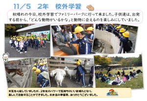 秋晴れの今日、校外学習でファミリーパークに行って来ました。子供達は、出発する前から、「どんな動物がいるかな」と動物に会えるのを楽しみにしていました。 ☆出発前の様子 校長先生と、「けがをしないこと」、「出会った人にはあい