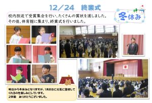 12月24日(水) まず、校内放送で授賞集会を行い、たくさんの賞状を渡しました。 次に、体育館に集まり、終業式がありました。 校長先生のお話を聞き、校歌斉唱をしました。 その後、学年の代表児童の発表がありました。 最後に
