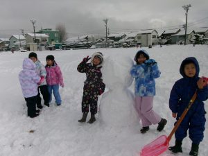 たくさん雪が降り、雪遊びをしました。 大きな雪だるまやかまくらを作ったり、雪合戦をしたり、楽しく雪で遊びました。 「雪の上に寝たらふかふかしていたよ」 「歩くとぎゅっぎゅっと音がしておもしろい!」 などと、雪の感覚を楽し