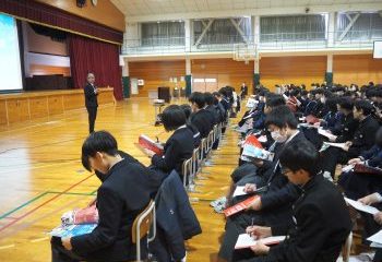 11月20日(木) 体育館にて高校進学説明会が行われました。 前半の部では、氷見高校、高岡龍谷高校、高岡第一高校、高岡向陵高校の4校から先生方に来ていただき、各学校の魅力や選抜入試についてお話を聞きました。