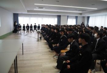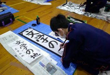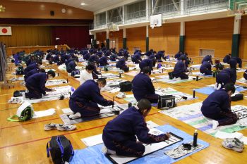 12月19日(金)3,4限 書初練習会を行いました。1,2年生は体育館、3年生は3年生棟の教室で行いました。 今年度の課題は、 1年生「伝統芸能」 2年生「文学の地」 3年生「初志貫徹」です。 1月8日(木)の本番に向け