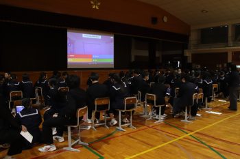 12月22日(月)5,6限 2年生の2学期末学年集会を体育館で行いました。 学年委員の生徒が学年全体や各クラスについて、2学期の良かった点と課題点をパワーポイントにまとめ、発表しました。 良い点として、男女問わず仲が良い