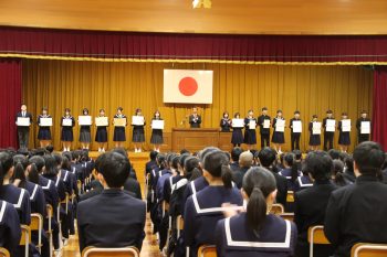 1月8日(木) 【始業式】 始業式が行われ、いよいよ三学期が始まりました。 3年生にとっては受験に向けたラストスパートの時期であり、同時に残り少ない中学校生活を過ごす大切な期間となります。1・2年生にとっては、最高学年・