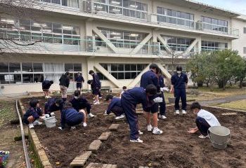 12月2日(火)放課後 本校の中庭の花壇にパンジー、チューリップの球根を植えるため、各クラスでボランティアを募ったところ多くの生徒が参加し、丁寧に苗木を植えてくれました。 きれいな花が咲くのを楽しみに待ちたいと思います。