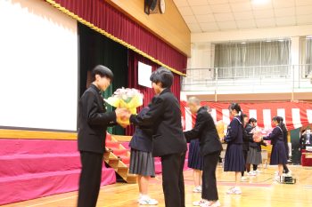 3月12日(木) 卒業式後に、卒業生が企画した門出式を行いました。 卒業生を代表して、山崎佑真くんが別れの言葉を、松田泰河くんが万歳三唱をしました。 また、校長先生からのお言葉では、とても良い卒業式をすることができたこと
