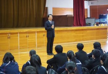 2月19日(木) 3名の講師の方々を招き、1・2学年合同発表会を行いました。 各学年が1年間、総合的な学習の時間で取り組み、学習したことのまとめとして、代表者が発表しました。 1年生は、2年前の能登半島地震をふまえ、「防