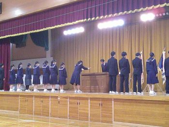 大会や美術・書道作品展の表彰がありました。特に美術展については多くの生徒が受賞し、代表生徒がステージ上で賞状を受け取りました。