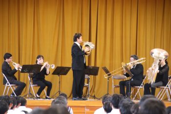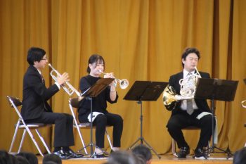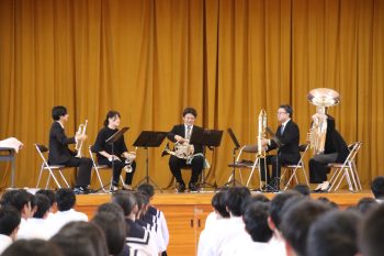 9月26日(金)6限 富山県、石川県出身の5人による金管5重奏コンサートが行われました。チューバ奏者の上森菜未さんは、北部中学校の卒業生で、母校での演奏をとても楽しみにしていたそうです。
