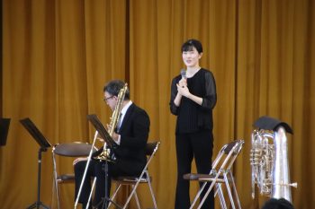 楽器紹介では、各金管楽器の歴史や、管をまっすぐ伸ばすとどれくらいの長さになるのかホースを使っての実演、金管楽器の音の出る仕組みについての実験など、分かりやすく解説してくださいました。