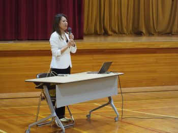 体育館にて生徒会による企画が行われました。二部構成となっており、第一部はアスリートフードマイスターの浅島麻希子先生による講演会でした。