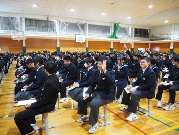 生徒会引き継ぎ式では、前期生徒会長の釣 栞奈さんから、後期生徒会長の鎌仲涼平さんへ生徒会印が手渡され、後期生徒会へ引き継がれました。