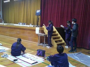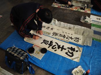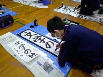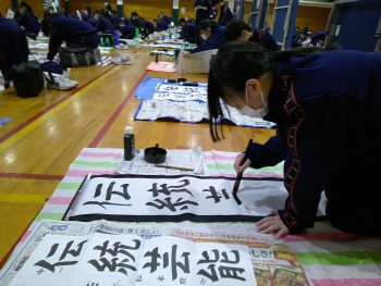 書初練習会 2025年12月19日 R7年度, 学校生活の様子 12月19日(金)3,4限 書初練習会を行いました。1,2年生は体育館、3年生は3年生棟の教室で行いました。 今年度の課題は、 1年生「伝統芸能」 2年生「文学の地」 3年生「初志貫徹」です。 1月8日(木)の本番に向けて、集中して取り組んでいました。 冬季休業中も練習に励みましょう。