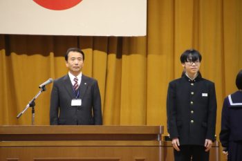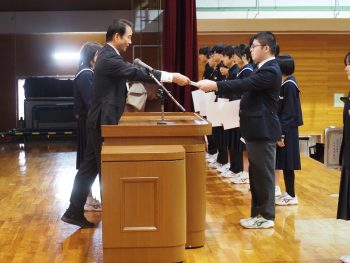 大会や美術・書道作品展の表彰がありました。特に美術展については多くの生徒が受賞し、代表生徒がステージ上で賞状を受け取りました。
