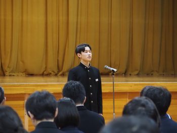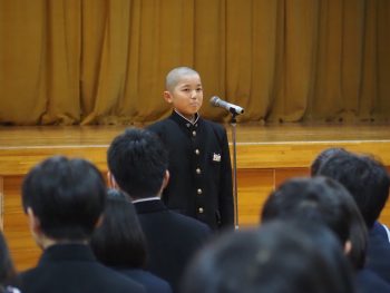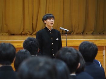 各学年の代表生徒が、2学期を振り返り、発表しました。合唱コンクールや委員会、部活動で頑張ったこと、受験に向けて頑張りたいことなど、堂々とした様子で発表していました。