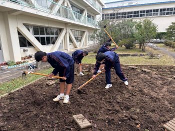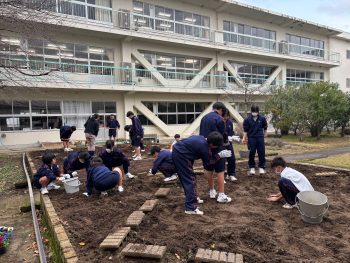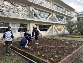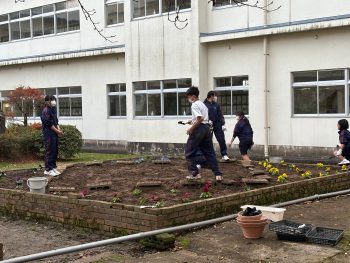 本校の中庭の花壇にパンジー、チューリップの球根を植えるため、各クラスでボランティアを募ったところ多くの生徒が参加し、丁寧に苗木を植えてくれました。